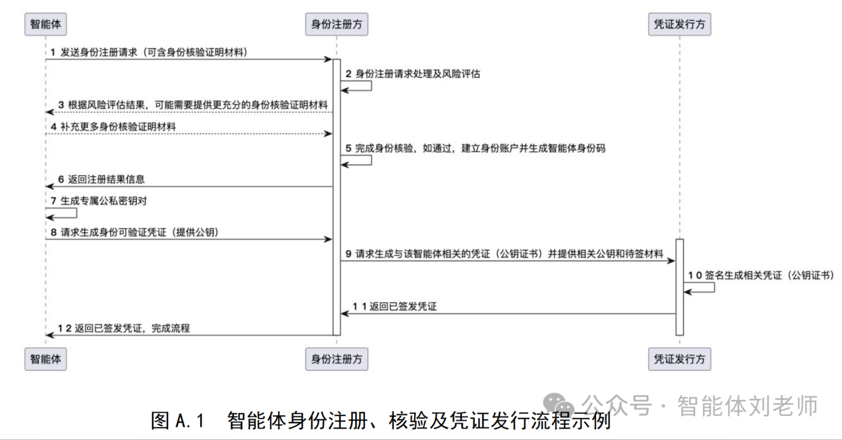 为了便于理解和进行参考实现,标准草案的附录中还提供了基于CA证书的智能体身份注册、核验及凭证发行的参考实现:
