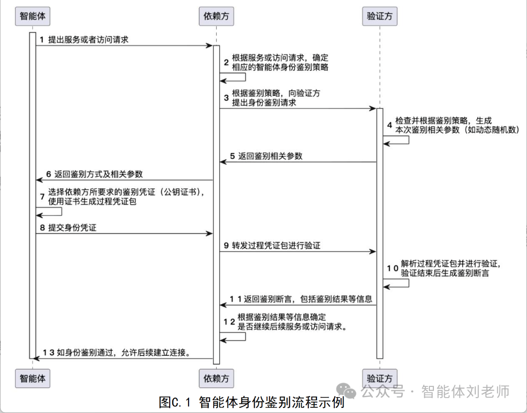 - 智能体身份验证方:通常来说,智能体可以依靠自身的能力(例如图中智能体B中的互联鉴权功能)基于协作智能体的身份凭证验证对方身份。但有的智能体为了提高安全性或追求轻载而将这部分功能委托给一个独立的身份验证方。例如:一个身份验证服务器。