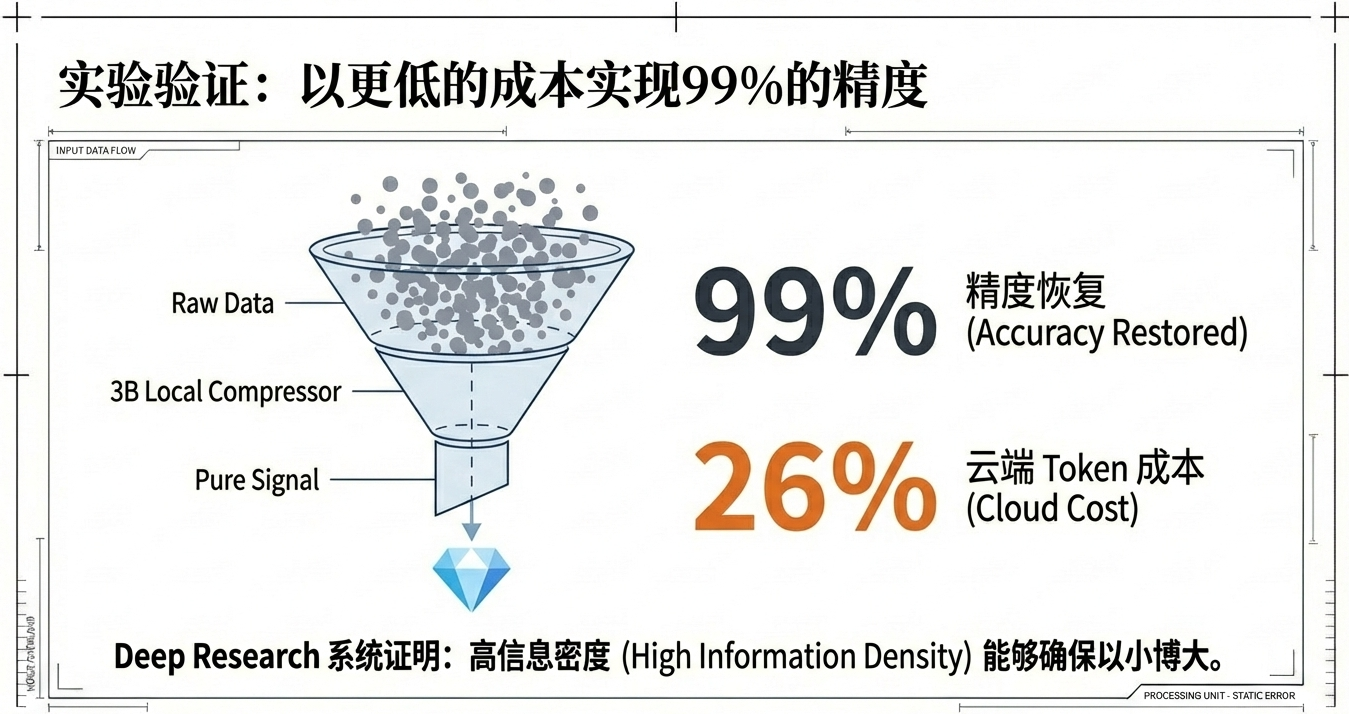 - 把这套原则放进 Deep Research 系统里,作者报告:3B 级别的本地压缩器可恢复 99% 前沿模型准确度,同时大模型调用的 token 成本降到 26%。