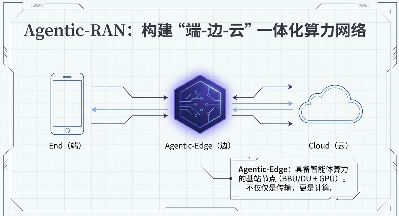 在Agentic-RAN中引入一个关键节点:Agentic-Edge——具备智能体算力与服务能力的 RAN 边缘节点。Agentic-Edge的一种实现方式是可以“插 GPU 卡并提供智能体运行环境的 BBU 或 DU”。由此形成一种协同的“端-边-云”架构: