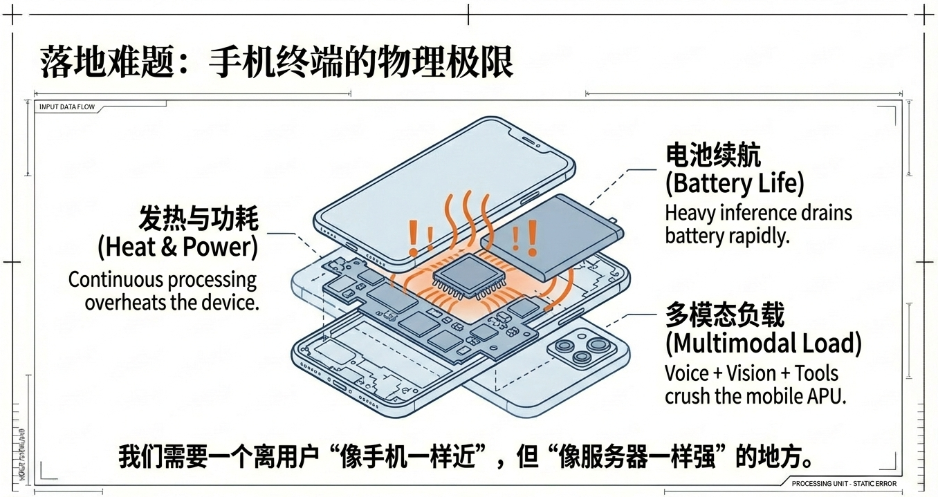 斯坦福论文提出了一套很好的经验方法,并且认为手机端是一个比较好的执行前置压缩器的位置。但是实际上,手机的端侧算力、能耗、发热、内存都是硬门槛。特别是多模态智能体(语音/视觉/检索/工具调用)并发时,端侧手机往往“顶不住”。