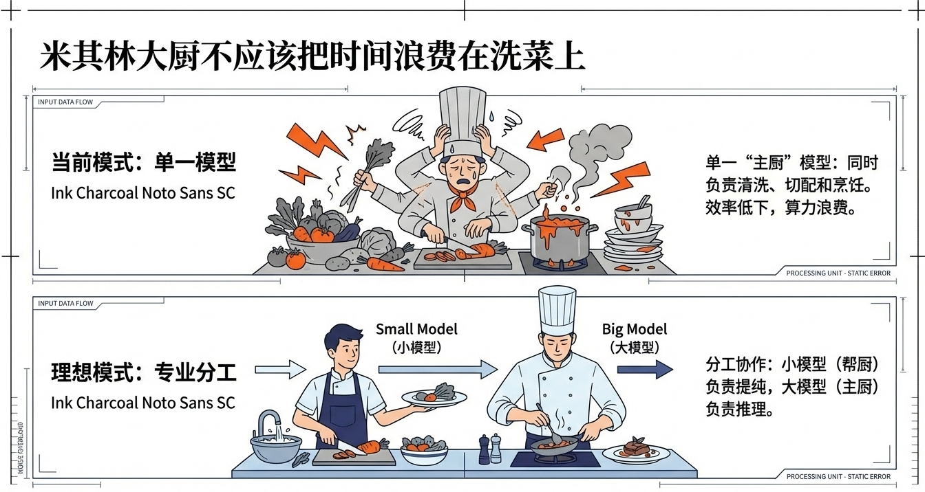 - 别让一个大模型从头到尾包办;让一个合适规模的“小大模型”先做信息提纯(就像小厨师先做“择菜、洗菜、切菜”),再把精华交给大模型做终局推理(就像大厨师最后“爆炒出锅”)。这样反而更准、更稳,还更省。