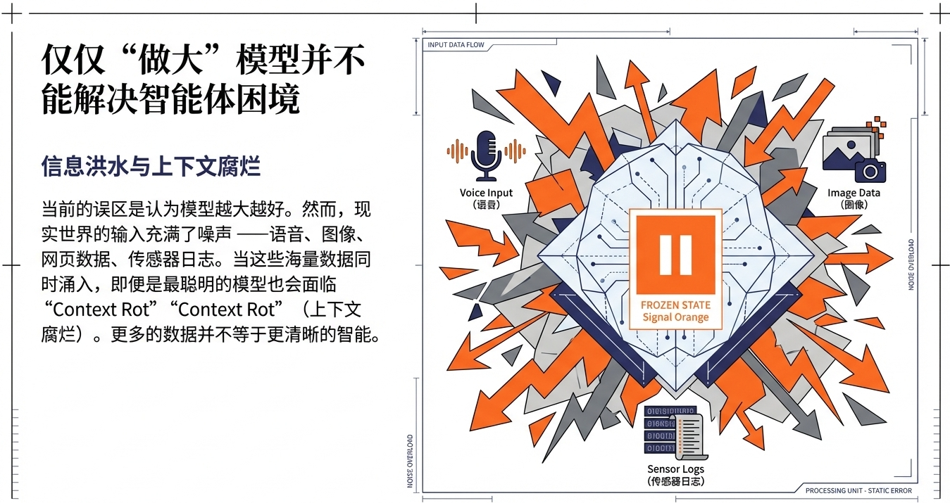 与此类似的,很多人做智能体系统时,第一反应是“上更大的模型就完事”。但现实世界的输入更像一场信息洪水:语音、图片、网页、传感器、对话历史一起涌进来。再聪明的大模型,也会像上面孤军奋战的大厨一样,被这些太杂、太长、太吵的“信息噪声”拖垮。Stanford的这篇论文把这种“信息越多反而越糊”的失效模式叫作 context rot(上下文腐烂)。